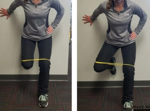 Place a band above your knees. Rest one foot on the wall behind you and hinge forward at the hips without rounding your back.