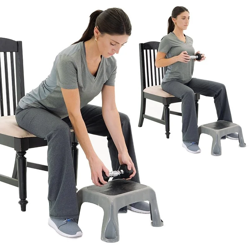 Sit in a chair with good posture and a dumbbell on a lower surface like a step stool.